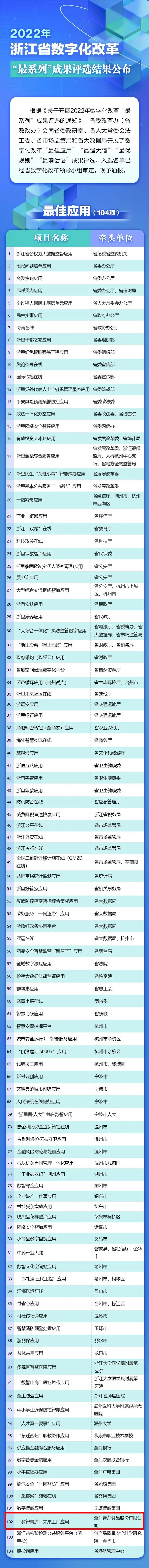 10月29日,省委改革辦(省數改辦)公布2022年數字化改革“最系列”成果。其中,浙江青蓮食品股份有限公司“數智青蓮”未來工廠獲得“最佳應用”殊榮,也是全省入選者中唯一一家未來工廠!